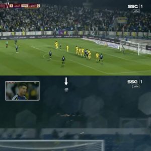 صورة توضح تنفيذ غريب وعجيب من كريستيانو رونالدو لركلة حرة في مباراة النصر والتعاون بكأس السوبر السعودي يُقال أن الكرة طاحت فوق المدرجات وخرجت من الملعب بأكمله