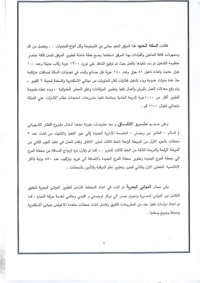 وأبرز “عرفات” مخططات التطوير، مثل التعاقد على صفقة الـ 1300 عربة قطارات، بجانب 100 جرارا أمريكي جديد من “جنرال الكتريك”، مبرزا إنجازاته في مجالات النقل الأخرى.