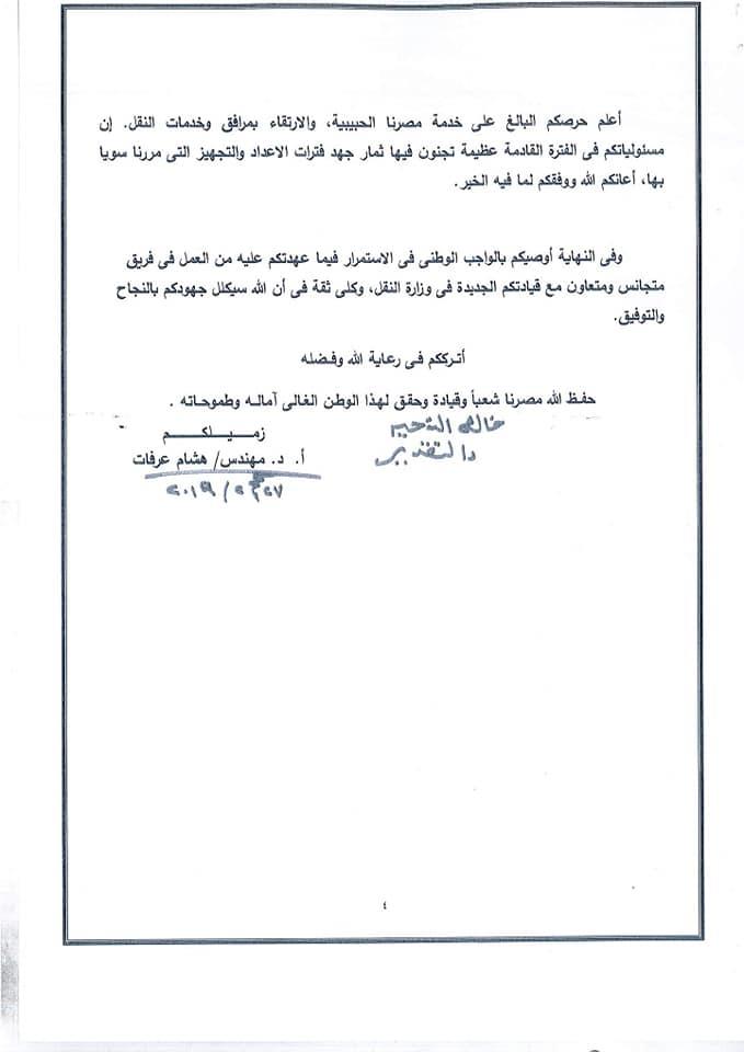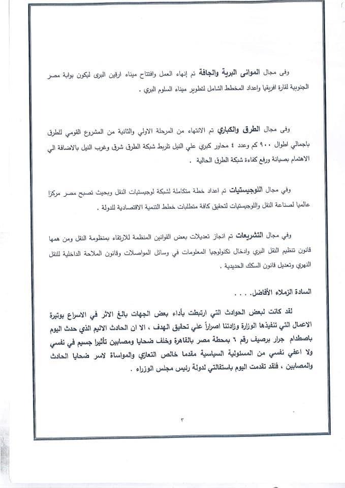 النص الكامل لإستقالة هشام عرفات، وزير النقل.