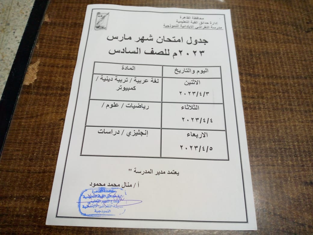 أعلنت إدارة مدرسة النقراشي الابتدائيه المتمثلة في الأستاذة منال محمد محمود مديرة المدرسة والأستاذ عصام الدين محمد وكيل المدرسة مواعيد اختبارات شهر مارس للصفوف الرابع والخامس والسادس والتي ستبدأ بداية الأسبوع المقبل حيث تبدأ الاختبارات الاثنين الثالث من إبريل 2023.