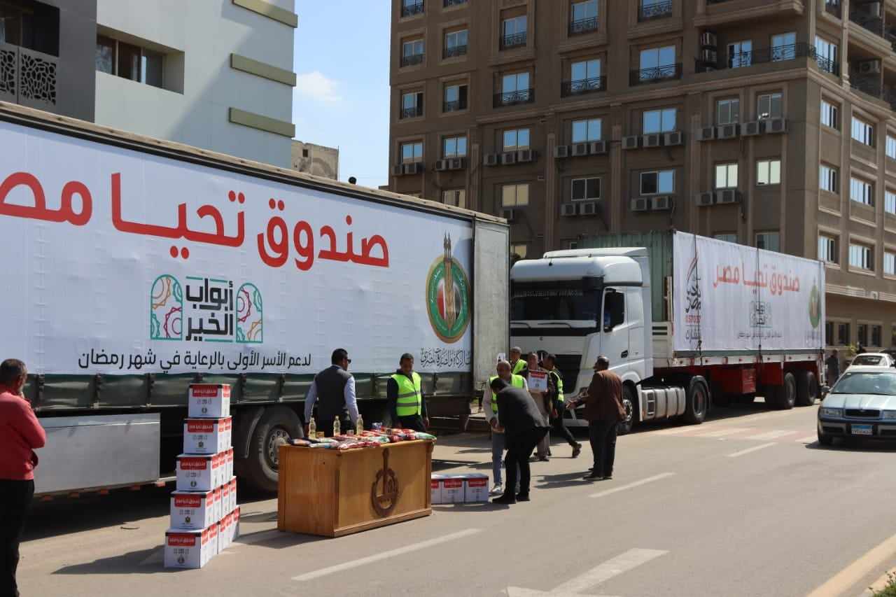 ب 413 طن من المواد الغذائية الجافة، ليتم توزيعها على 170 ألف مواطن من الأسر المستحقة والأولى بالرعاية، في عدة مراكز منها بنها وطوخ وكفر شكر وشبين القناطر والقناطر الخيري وشبرا الخيمة والخانكة والعبور والخصوص في محافظة القليوبية.
