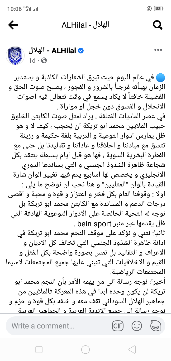 نشرت صفحة نادي الهلال السوداني على فيس بوك منشورا تدعم فيه محمد أبو تريكة المحلل الكروي بقنوات بي ان سبورت بخصوص انتقاده لمساندة ودعم الشواذ بالدوري الانجليزي جاء فيه: