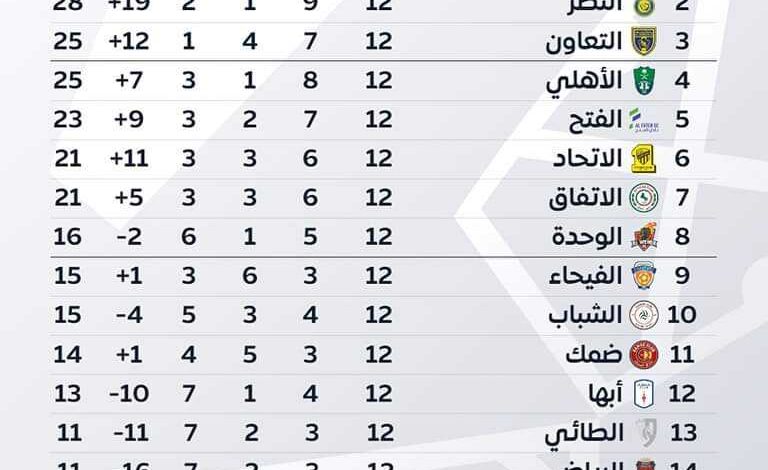 اسفرت نتائج الجولة ١٢ للدورى السعودي  عن استمرار تصدر الهلال بفارق أربع نقاط عن نادي النصر وبفارق سبعة نقاط عن نادي التعاون.