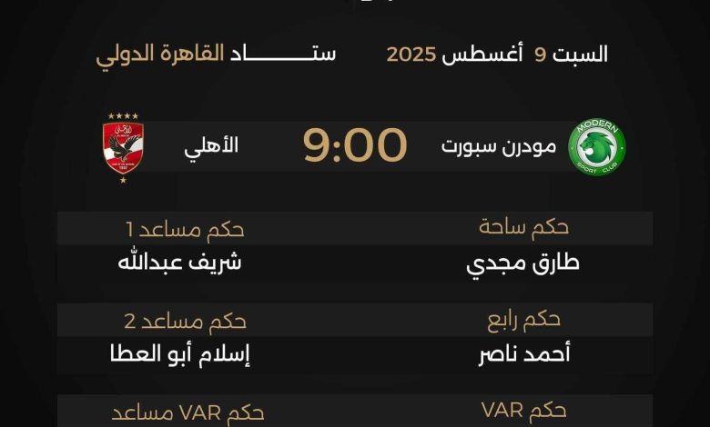 في إطار الجولة الأولى من الدوري المصري الممتاز موسم 2025–2026، يلتقي النادي الأهلي مع ضيفه مودرن سبورت مساء اليوم السبت الموافق 9 أغسطس 2025، على استاد القاهرة الدولي، في تمام الساعة التاسعة مساءً بتوقيت القاهرة.