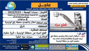 وبناءً على ذلك تنوه الشركة أنه سيتم قطع المياه عن منطقة الوليدية وقرية منقباد ولمدة 6 ساعات بدءً من الساعة الثانية عشر ليلا يوم الجمعة الموافق 23 سبتمبر 2022 م حتى الساعة السادسة فجر السبت الموافق 24 سبتمبر 2022م ، نظراً لتوقف محطتي رفع صرف صحي الوليدية، ورفع صرف صحي منقباد.