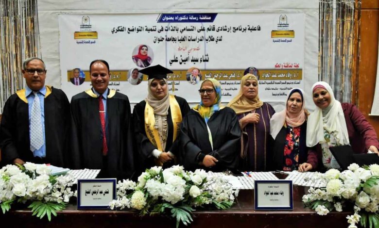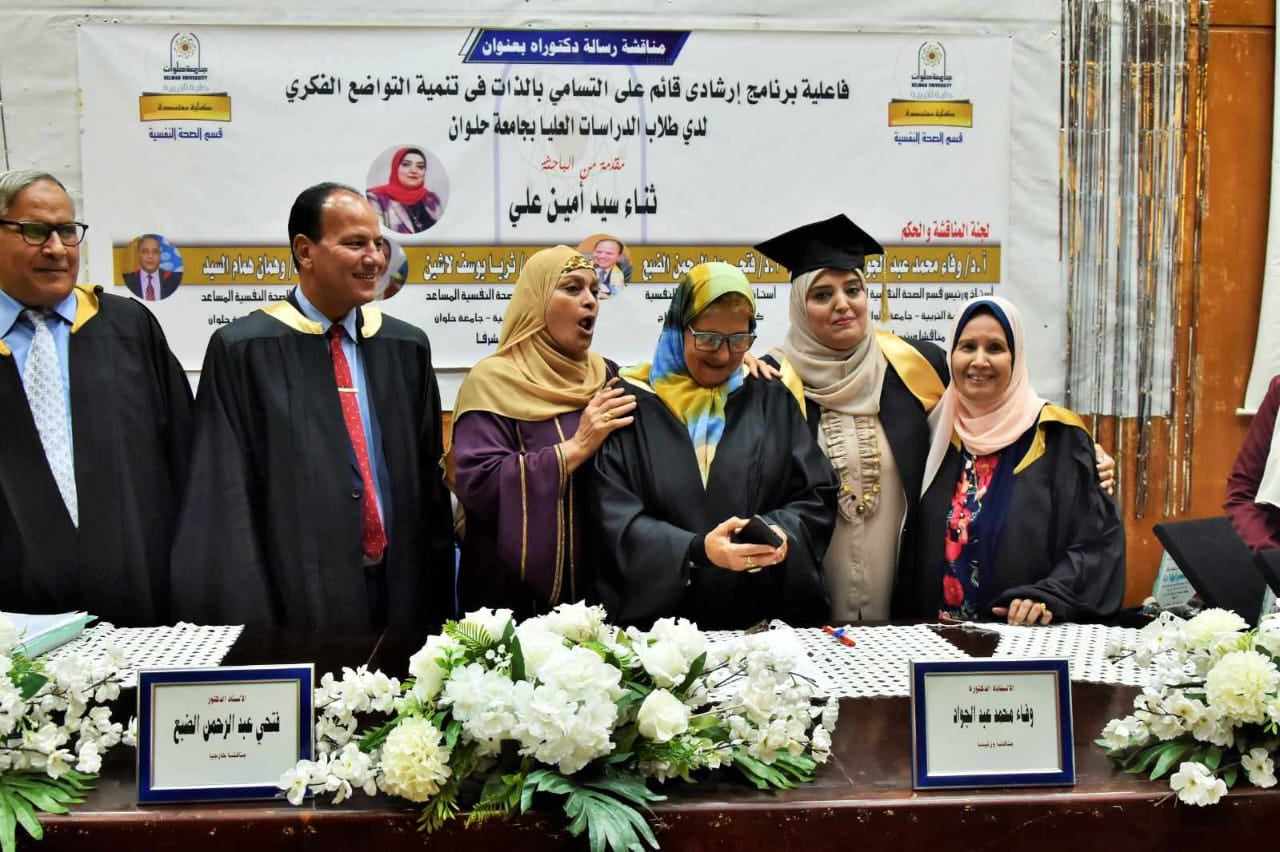 وتم مناقشة رسالة الدكتوراة في مدرج 8 أ بجامعة حلوان، وذلك برئاسة الأستاذ الدكتور وفاء محمد عبدالجواد، رئيس قسم الصحة النفسية السابق بكلية التربية جامعة حلوان، الأستاذ الدكتور فتحي عبدالرحمن، رئيس قسم الصحة النفسية بكلية التربية جامعة حلوان، مناقشا، الدكتورة ثريا يوسف لاشين، أستاذ الصحة النفسية المساعد، مشرفا، الدكتور وهمان همام السيد، أستاذ الصحة النفسية المساعد، مشرفا .