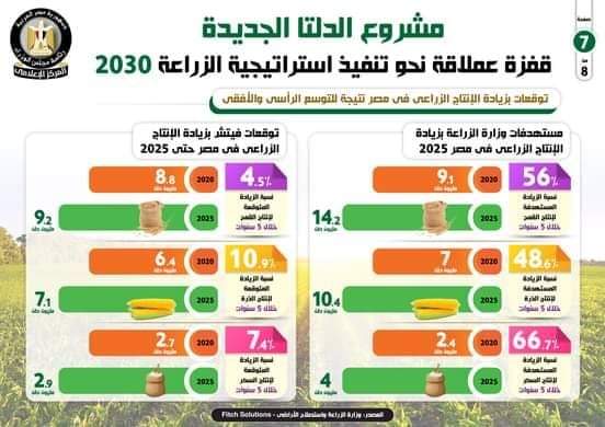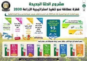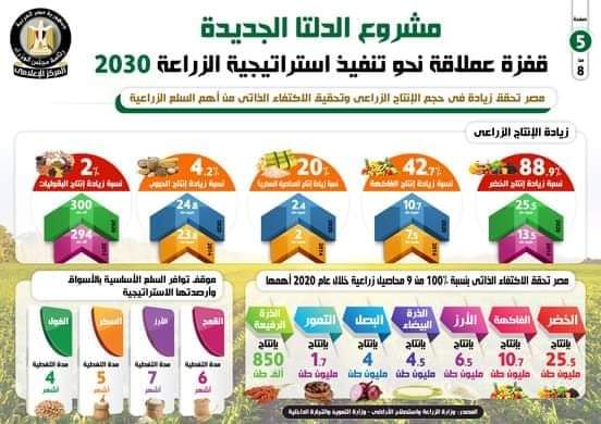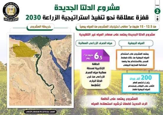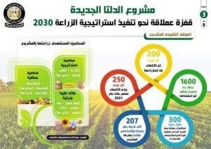 وفي هذا الصدد نشر المركز الإعلامي لمجلس الوزراء، تقريراً تضمن إنفوجرافات تسلط الضوء على مشروع الدلتا الجديدة والذي يعد قفزة عملاقة نحو تنفيذ استراتيجية الزراعة 2030