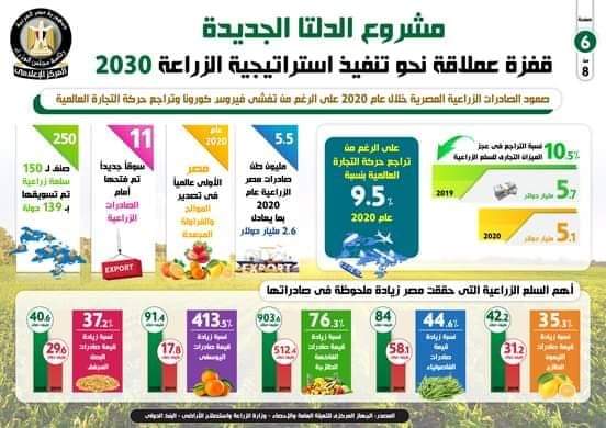 وخلال عام 2020 جاءت مصر في المركز الأول عالمياً في تصدير الموالح والفراولة المجمدة كما بلغ حجم صادرات مصر الزراعية 5.5 مليون طن بما يعادل 2.6 مليار دولار وتم فتح 11 سوقاً جديداً أمام الصادرات الزراعية، وتسويق 250 صنف لـ 150 سلع زراعية بـ 139 دولة