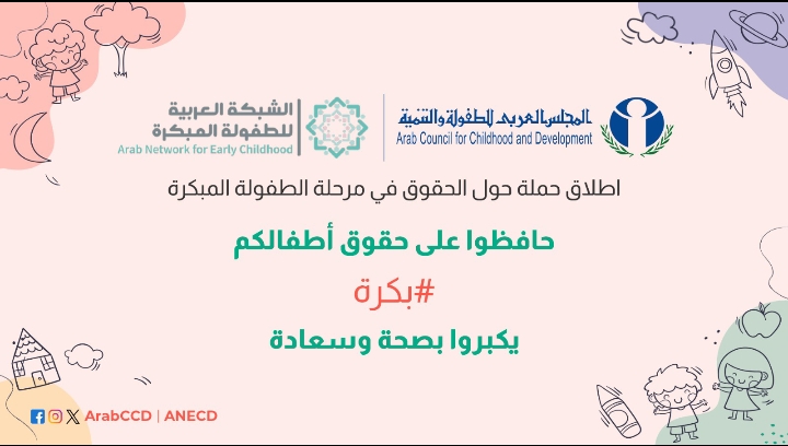تحت هاشتاج حافظوا على حقوق أطفالكم #بكره يكبروا بصحة وسعادة، تنطلق حملة المناصرة للتعريف بحقوق الطفل في مرحلة الطفولة المبكرة، بالشراكة بين كل من المجلس العربي للطفولة والتنمية والشبكة العربية للطفولة المبكرة.