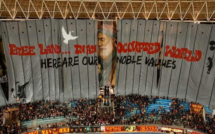 التيفو الأول يعرض مشهد الشيخ خالد نبهان مع حفيدته ريم “روح الروح” وقصادهم جدار عازل وهو الجدار العازل بينا وبينهم في رفح والجدار مش مقصود بيه مصر تحديدا لكن مقصود بيه العالم كله اللي شايفهم شهور بيتم ابادتهم ومفيش أي حد بيتحرك تحرك فعلي..