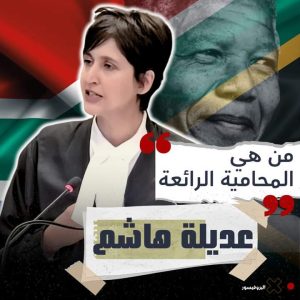 الشخصية الأولى .. عديلة هاشم محامية من جنوب افريقيا من اصول يمنية .. وواحدة من فريق دفاع جنوب افريقيا قصاد محكمة العدل الدولية في القضية اللي رفعتها جنوب افريقيا على الصهاينه وهنا استخدام شخصية بعينها لتكريمها لعظمة المرافعة اللي قدمتها قصاد المحكمة واستخدامها كرمز لكل محامي منهم.