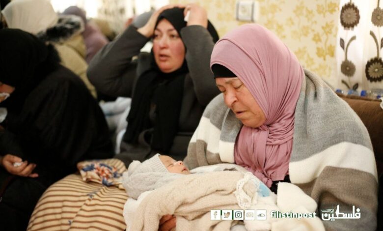 الصورة التالية تصور مشهدا مؤثرا حيث تحتضن والدة الشــهيد عبد الله قلالوة طفله الذي رزق به قبل شهر.