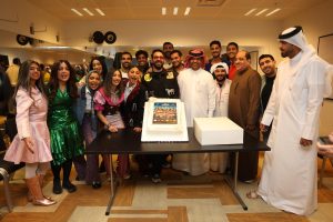 والتف فريق العمل لتقطيع التورتة وأخذ الصور التذكارية وأعربوا عن سعادتهم بالجمهور القطري حيث ان بعضا من الممثلين تعد هذه التجربة الأولى لهم على المسارح القطرية.