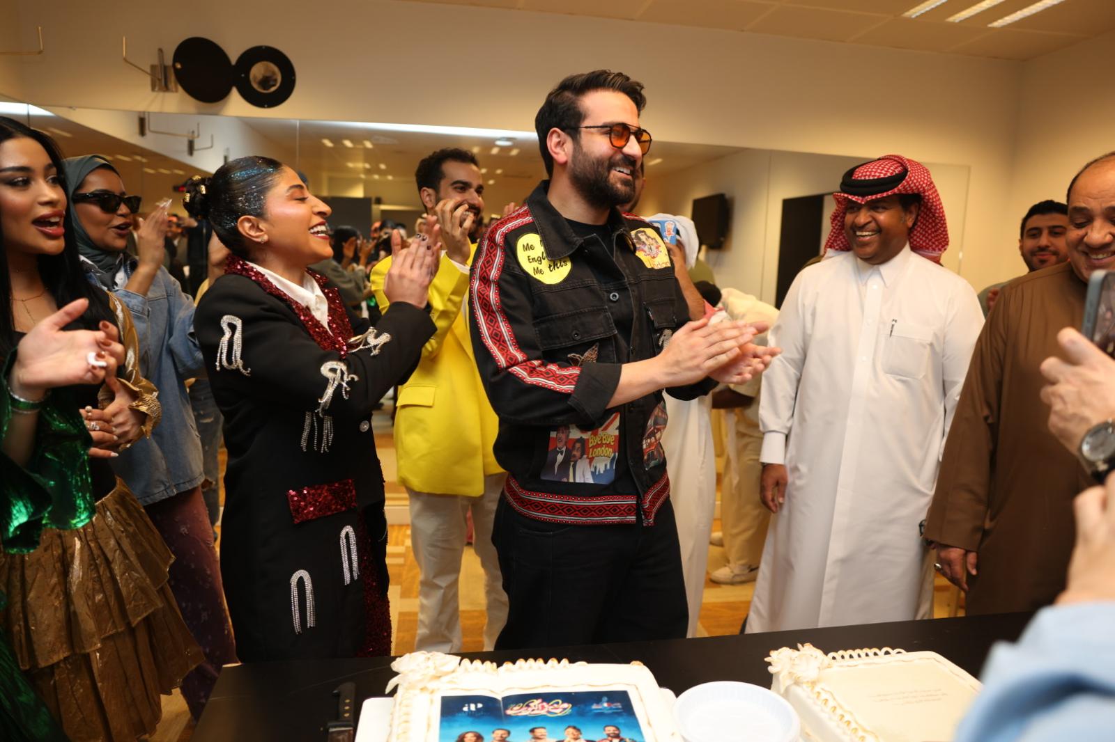 والتف فريق العمل لتقطيع التورتة وأخذ الصور التذكارية وأعربوا عن سعادتهم بالجمهور القطري حيث ان بعضا من الممثلين تعد هذه التجربة الأولى لهم على المسارح القطرية.