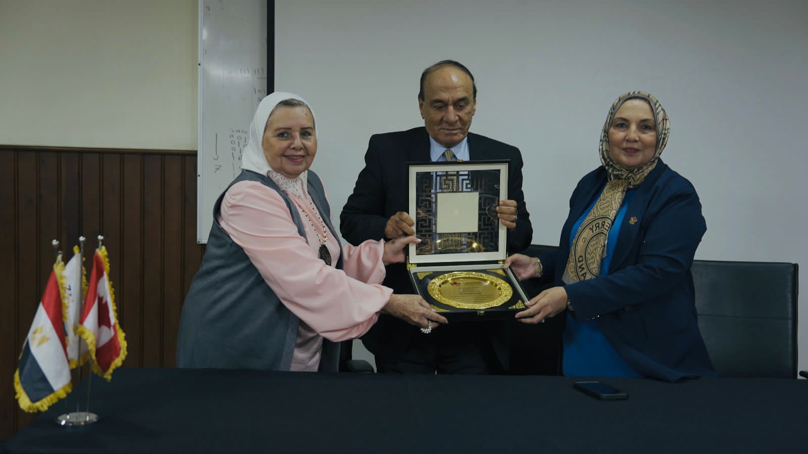 وفي نهاية الندوة، قامت الدكتورة ماجي الحلواني، رئيس مجلس إدارة الإعلام، والدكتورة أمال الغزاوي، عميدة إعلام CIC، بتقديم درع الجامعة إلى اللواء سمير فرج تقديرًا لمجهوداته.