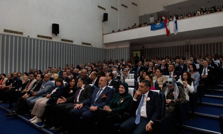 احتفلت السفارة الروسية بالقاهرة بعيد النصر ال 80 بمسرح المركز الثقافي الروسي بالقاهرة بحضور السفير الروسي جيورجي بوريسينكو،وسفراء دول بيلاروس،وكازاخستان وارمينيا واذربيجان ومنغوليا صربيا ، كما شارك د.ابراهيم كامل رئيس جمعية الصداقة المصرية الروسية ،والسفير عزت سعد مدير المجلس المصري للتعاون الخارجي ، والمستشار عدلى حسين محافظ القليوبية السابق ،وارسيني ماتيوشينكو القائم بأعمال مدير المراكز الثقافية الروسية في مصر ،وشريف جاد رئيس الجمعية المصرية لخريجي الجامعات الروسية والسوفيتية، ود.اشرف عطية وكيل كلية الالسن جامعة عين شمس ، ود.دينا محمد رئيس قسم اللغة الروسية بجامعة عين شمس، ود.محمد نصر الجبالي عميد كلية الالسن بجامعة الاقصر الاسبق واستاذ الادب واللغة الروسية.