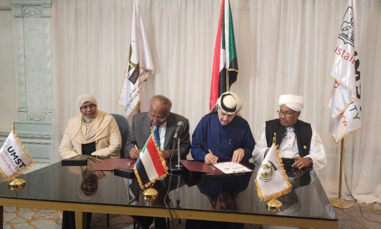 وبين جامعة العلوم الطبية والتكنولوجيا، د. مأمون محمد علي حميدة رئيس مجلس أمناء الجامعة د. مشاعر احمد الامين عبدالله مدير معهد السودان الانمائي