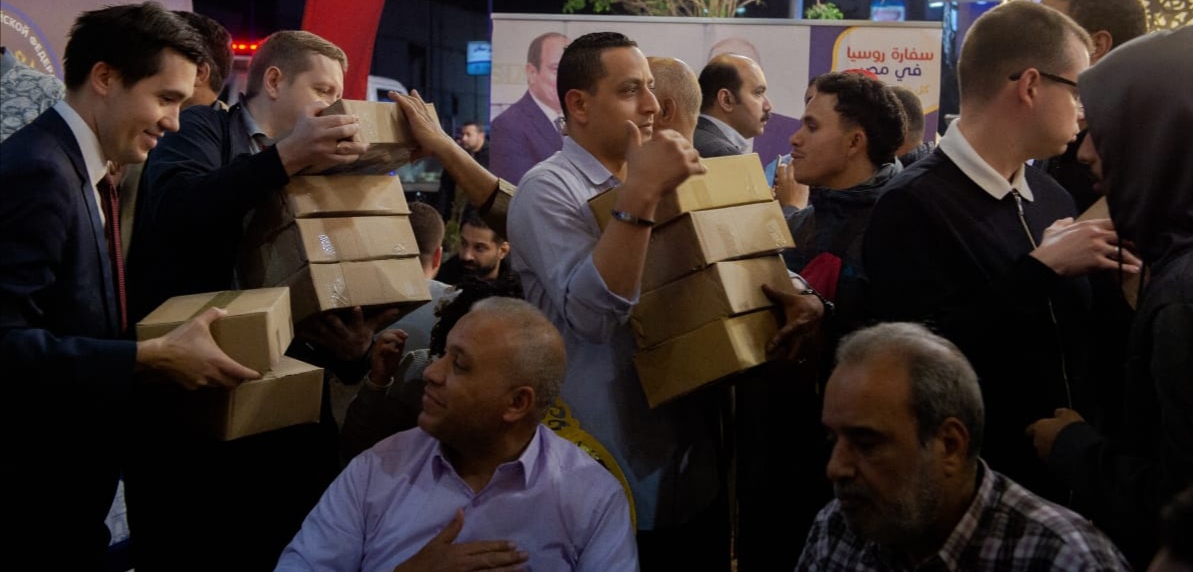 وفي ختام حفل الافطار قام اعضاء السفارة الروسية بتوزيع كرتونة رمضان على ضيوف المائدة من سكان الدقي.