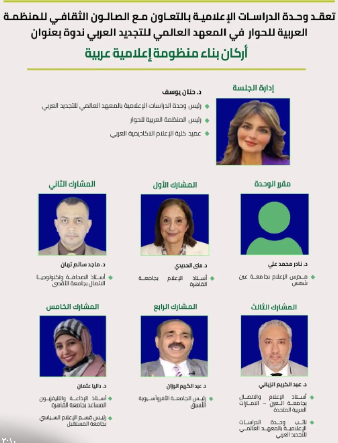 تحت رعاية المنظمة العربية للحوار والتعاون الدولي وبالتعاون مع وحدة الدراسات الاعلامية بالمعهد العالمي للتجديد العربي باسبانيا انعقدت فعاليات الدورة التاسعة والخمسون إلكترونيًا عبر تطبيق (زووم)، وذلك من خلال عقد ملتقي بعنوان “اركان بناء منظومة إعلامية عربية “، بحضور عدد كبير من النخبة والأكاديميين والمتخصصين من جميع انحاء الوطن العربي .