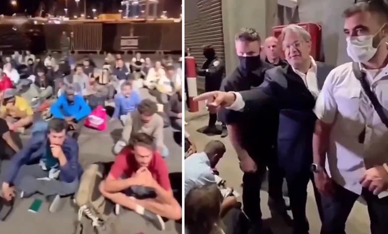 وأظهرت مقاطع مصورة نشرها حساب الأسطول على منصة (إكس)، بن غفير وهو يشير بيده إلى الناشطين الجالسين على الأرض في ظروف قاسية داخل مكان اعتقالهم، مرددًا: “هؤلاء هم إرهابيو الأسطول.. جاءوا دعمًا لغزة وللإرهابيين وليس لتقديم المساعدة”.