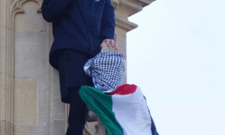 بالفيديو:رجل يتسلق برج “بيغ بن”رافعاً علم فلسطين