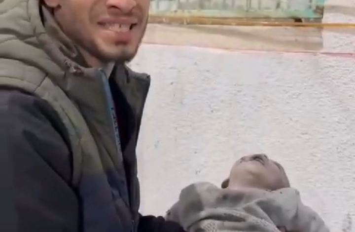 استمرارا لطغيان الاحتلال الإسرائيلي وقتله الأبرياء والعزل استشهدت طفلة فلسطينية جراء غارات الاحتلال الإسرائيلي على رفح جنوب القطاع.ويظهر في المقطع رحل يحمل هذه الطفلة الصغيرة قائلا:والله حرام.