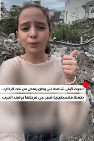 طفلة فلسطينية تبعث رسالة فرحة وسعادة لوقف إطلاق النار في غزة وتقول:”الحمدلله نجوت من القصف والموت والرعب والنزوح…. نجوت لأكون شاهدة على وطن ينهض من تحت الركام”