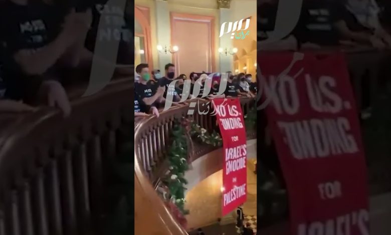 وفي اطار الرفض الشعبي داخل امريكا لاستمرار العدوان على غزة، اقتحم متظاهرون أمريكيون مبنى الكابيتول بولايةكاليفورنيا الامريكية، لإيقاف جلسة المشرعين، وهم يهتفون لفلسطين ولإيقاف الحرب على غزة.
