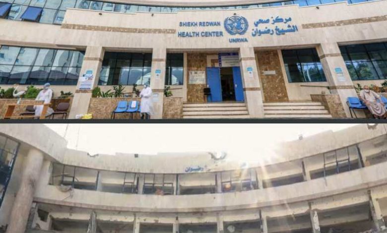 ونشرت الأونروا صور صادمة تظهر مستوى الدمار قبل وبعد الذي لحق بمركزها الصحي في شمال غزة.