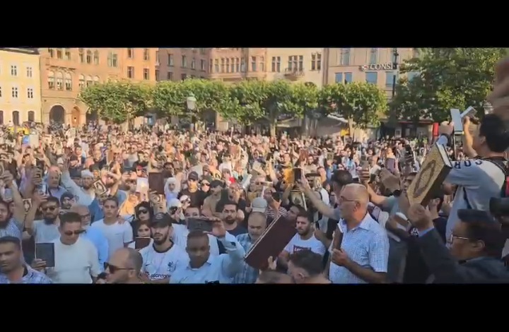 بالفيديو : حشود المسلمين ترفع المصاحف وتتلو القرآن الكريم بالسويد