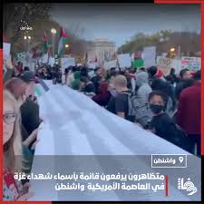 بالفيديو : رفع لافتة ضخمة بأسماء شهداء غزة في شوارع واشنطن خلال مظاهرة حاشدة
