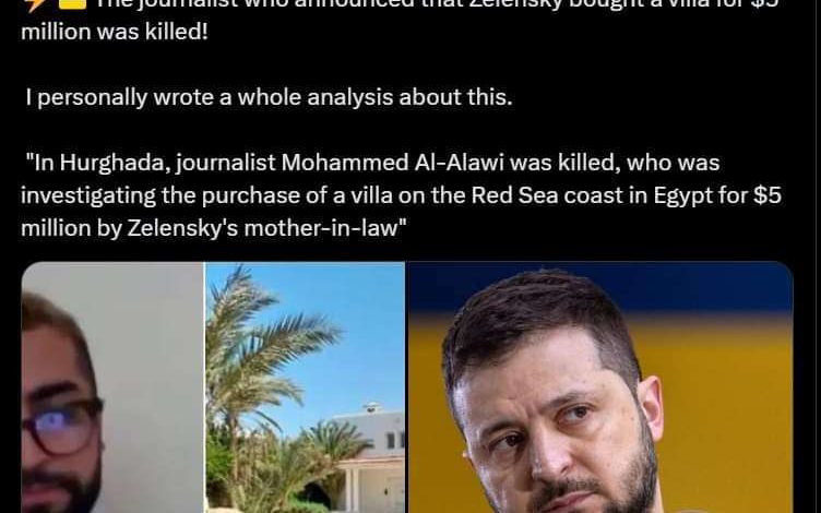 قبل موته بأربعة أشهر كشف الصحفي عن تقرير استقصائي يُعتقد أنه السبب في اغتياله حيث نشر عن منتجع فاخر فى الجونة – الغردقة اشترته أم زوجة زيلنسكي (أولجا كياشكو) بمبلغ (4.85) مليون دولار، ويشتبه أن هذا المبلغ من المساعدات الأمريكية لأوكرانيا، وأتهم محمد العلوى زيلنسكي بتحويل الأموال لمصالحه الشخصية.