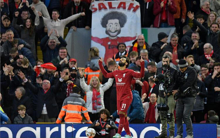 احتفلت جماهير نادي ليفربول الانجليزي بمهاجم الفريق النجم المصري محمد صلاح بعد أن قاد فريقه لالحاق أول هذا الموسم بمانشستر سيتي بطل الدوري الإنجليزي ، في المباراة التي اقيمت بين الفريقين يوم الأحد 16 أكتوبر 2022.