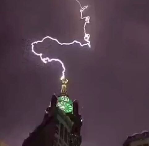 وثق مقطع فيديو متداول على مواقع التواصل الاجتماعي صاعقة رعدية وهي تضرب برج الساعة أثناء هطول الأمطار على مدينة مكة.