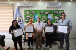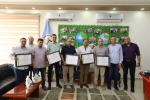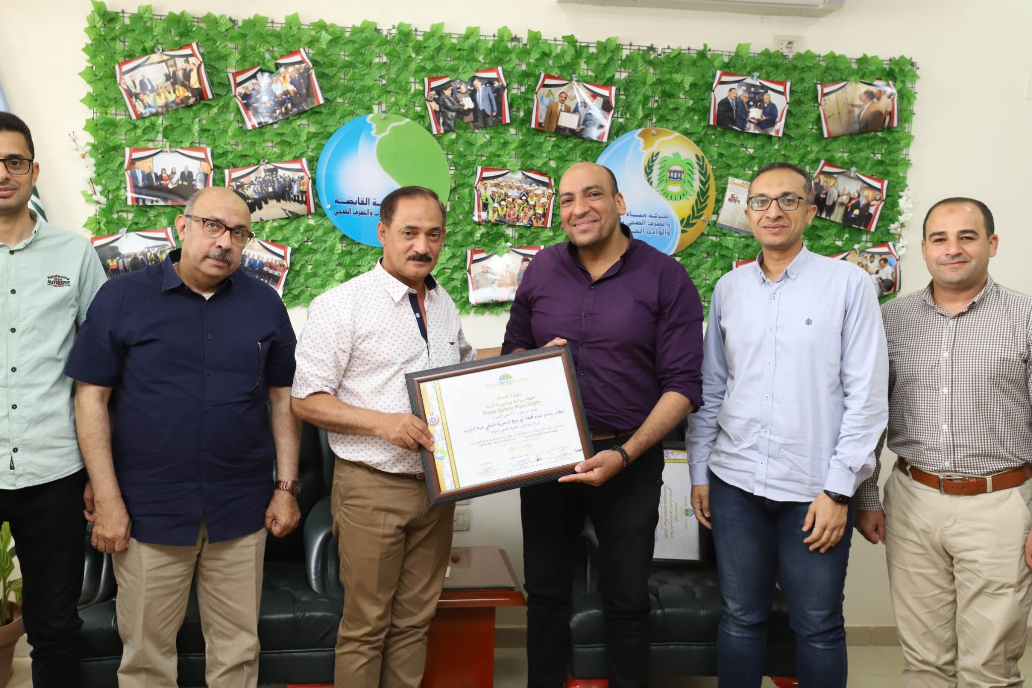 رئيس مجلس الإدارة والعضو المنتدب للشركة مع ممثلي الشركة القابضة للمياه، لتسليم شهادة الاعتماد متقدماً ” الشرقاوي ” بأسمي آيات الشكر والتقدير للشركة القابضة على دعمها المستمر لخطط سلامة ومأمونية المياه حتى تكون موارد المياه آمنة ومقبولة على الدوام.