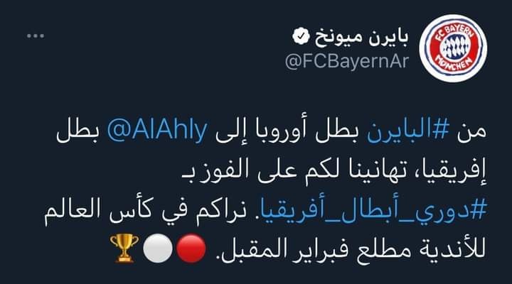 هنأ بايرن ميونيخ الألماني بطل اوروبا النادي الأهلي بفوزه باللقب الإفريقي ، ونشر على موقعه الرسمي يقول : مبروك نراكم في كأس العالم للأندية