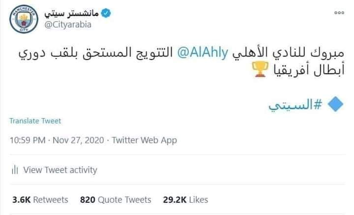 كما هنأ مانشستر سيتي الإنجليزي النادي الأهلي وكتب على صفحته الرسمية يقول : مبروك الأهليالتتويج المستحق بلقب دوري أبطال افريقيا .