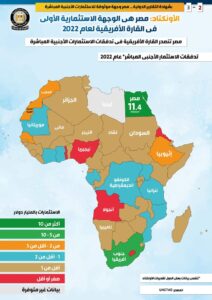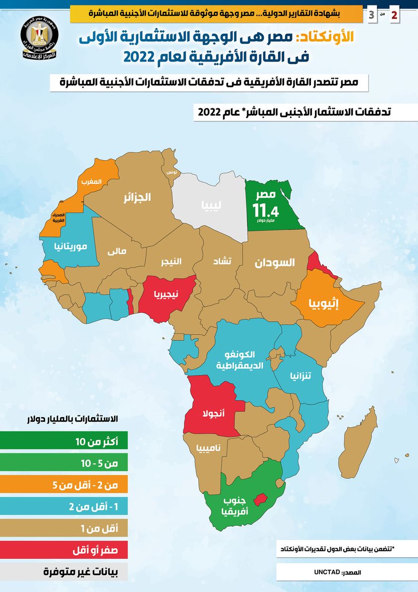 وفي هذا الصدد نشر المركز الإعلامي لمجلس الوزراء تقريراً تضمن إنفوجرافات تسلط الضوء على تقرير الأونكتاد الذي يؤكد أن مصر هي الوجهة الاستثمارية الأولى في القارة الأفريقية لعام 2022، كما أبرزت أن مصر وجهة استثمارية موثوقة بشهادة التقارير الدولية.