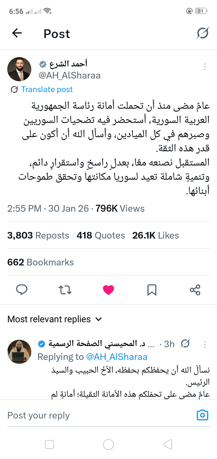 نشر الحساب الرسمي للرئيس السوري أحمد الشرع على منصة x منشورا بمناسبة مرور عام على توليه مقاليد الحكم في سوريا جاء فيه: