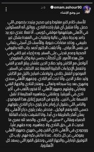 الاعتذار الرسمي: قدم اللاعب اعتذاراً صريحاً لمجلس إدارة النادي الأهلي، والجهاز الفني، وزملائه اللاعبين، معرباً عن تقديره التام لجمهور النادي الذي وصفه بـ “السند”.