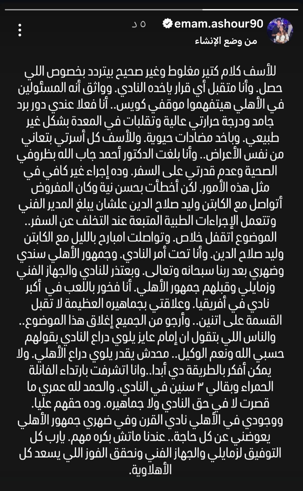 أصدر اللاعب إمام عاشور، صانع ألعاب النادي الأهلي، بياناً رسمياً عبر حساباته الشخصية، يوضح فيه الحقائق المتعلقة بما تداولته وسائل الإعلام ومنصات التواصل الاجتماعي حول غيابه عن رحلة الفريق الأخيرة.