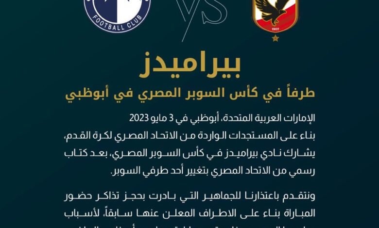 يشارك نادي بيراميدز في كأس السوبر المصري بعد كتاب رسمي من الاتحاد المصري بتغيير أحد طرفي السوبر