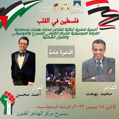 تم تأجيل الأمسية الشعرية الغنائية “فلسطين في القلب” لفرقة المركز الموسيقية بمشاركة الشاعر الكبير محمد بهجت؛ لتقام في تمام الساعة السابعة مساء الثلاثاء المقبل ١٩ ديسمبر ٢٠٢٣م، بمسرح مركز الهناجر للفنون.