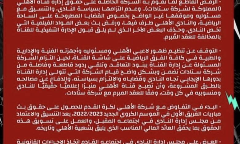 تأييد واسع وكبير لقرار الأهلي بمنع ظهور لاعبيه ونجومه بقناة الأهلي