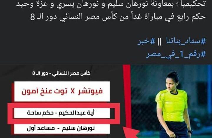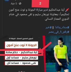 أسندت مشرفة الكرة النسائية تحكيم مباراة بين فريقي فيوتشر و توت عنخ امون للحكمة “أيه محمد عبد الحكيم” الشهيرة ب بطوط ، وكانت لجنة الحكام قد أسندت لنفس الحكمة ايضا مباراة بين “الجونة و توت عنخ آمون”
