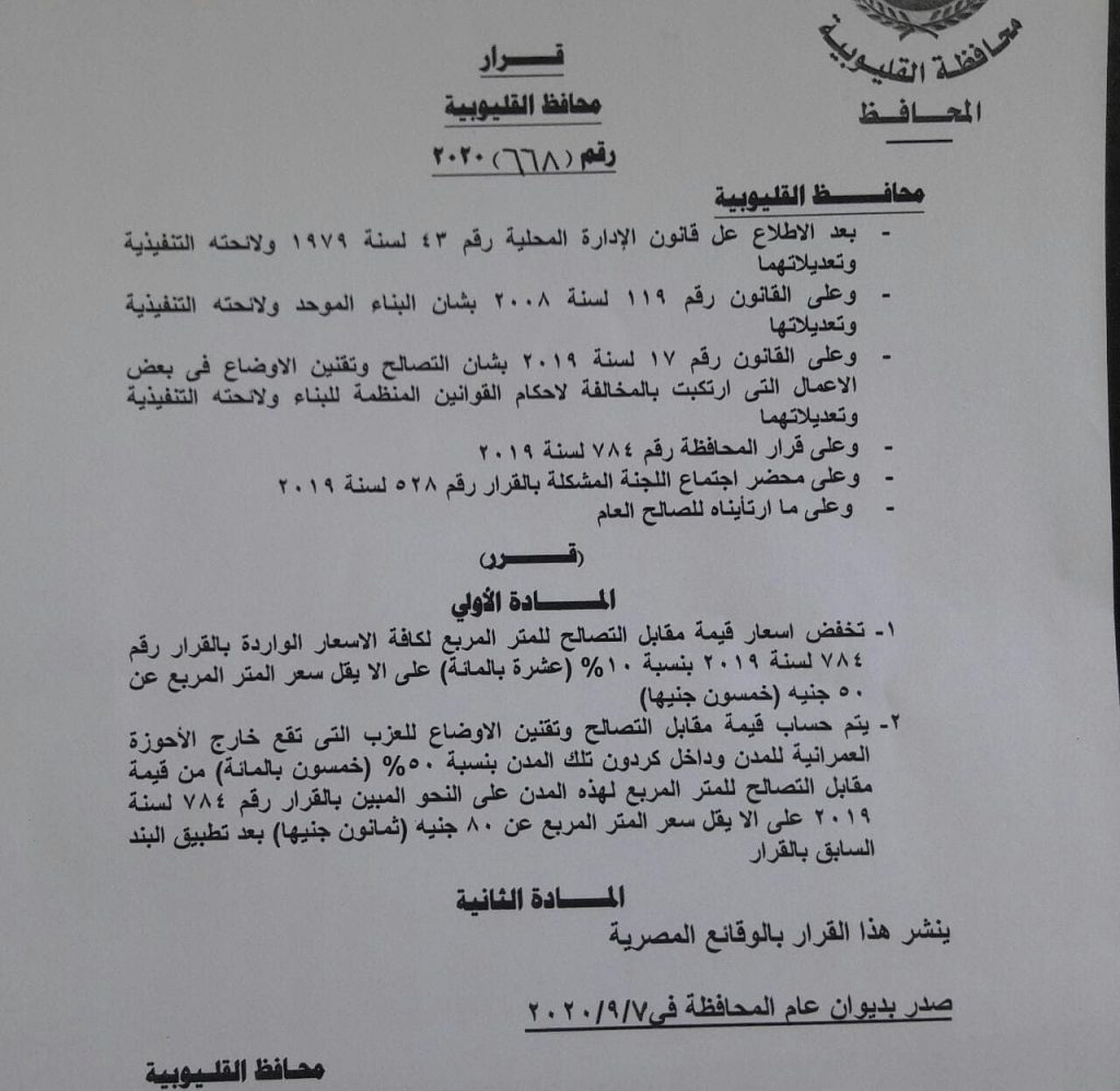 اصدراللواء عبدالحميد الهجان القرار ٢٦٨ لسنه ٢٠٢٠ بتخفيض اسعار قيمة التصالح في مخالقات البناء بنسبة 10 % للمتر لكافة الاسعار الوارده بالقرار 784 لعام 2019 على أن لا يقل سعر المتر المربع عن 50 جنيها للمتر .