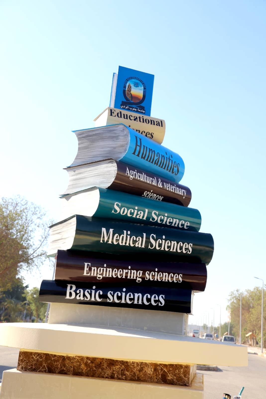 وميدان الكتاب عبارة عن مجسم ميداني يحتوي على مجموعة من مجسمات الكتب الدالة على العلم والمتضمنة للعلوم الأساسية مثل العلوم الهندسية، والعلوم الطبية، والاجتماعية، والزراعية، والبيطرية، والعلوم الإنسانية والتربوية، ويعلو المجسم في نهايته مجسم على هيئة كتاب به شعار جامعة جنوب الوادي.