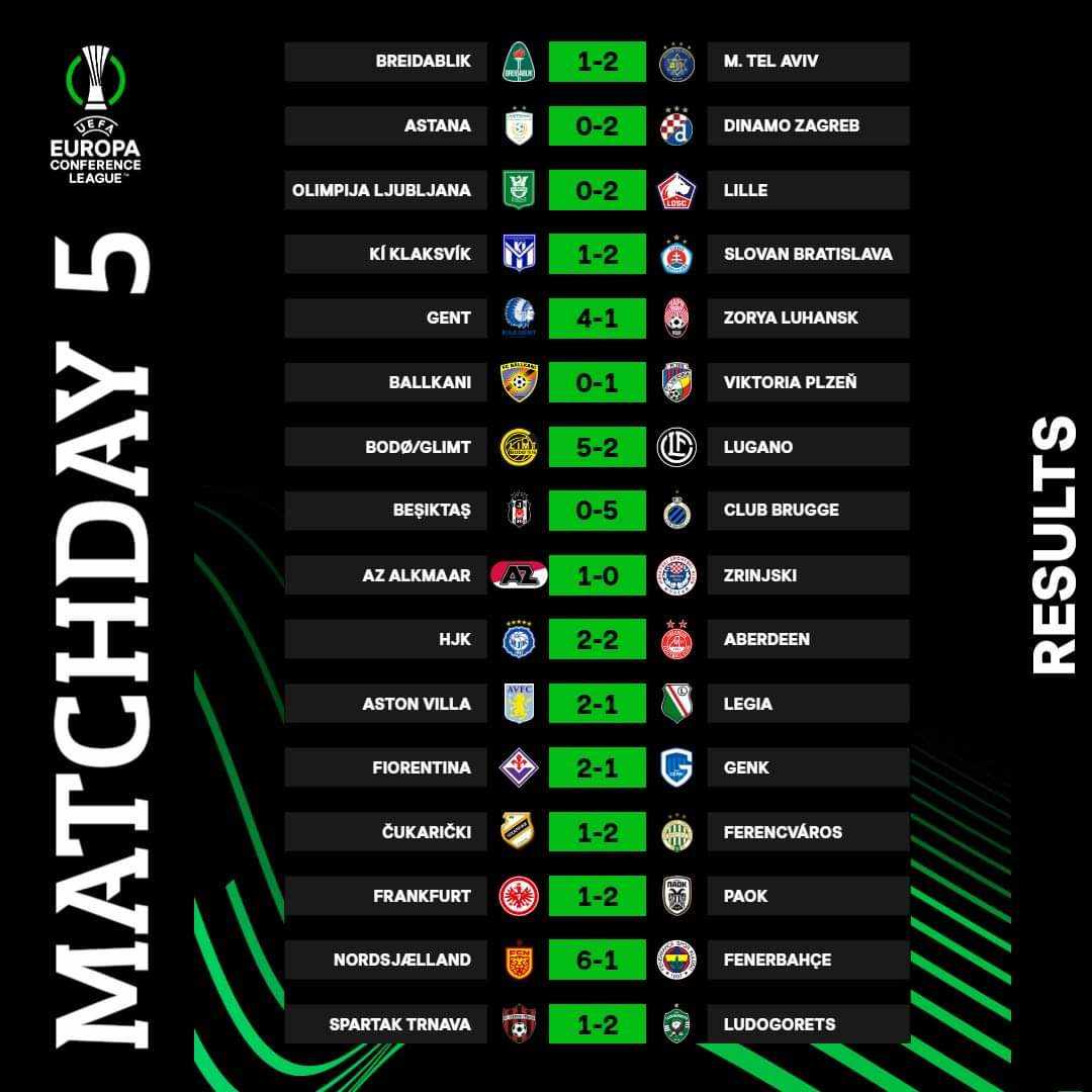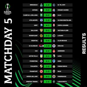 ترتيب المجموعات لدورى المؤتمر الاوربي ونتائج المباريات بعد الجولة الخامسة