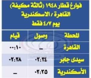 – تشغيل قطار 1948 ( ثالثة مكيفة )  الإسكندرية / أسوان  يوم 7 / 4 / 2024 فقط  حيث يقوم  من محطة الاسكندرية الساعة 11:50   ويصل أسوان الساعة 03:55 طبقا للجدول المرفق على أن يتم تشغيل فوارغ القطار يوم 7 / 4 / 2024 فقط   بين القاهرة / الاسكندرية حيث يقوم من القاهرة الساعة 00:10 ويصل الاسكندرية الساعة 02:35  طبقاً للجدول المرفق .