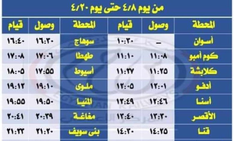 – تشغيل قطار 1944 ( ثالثة مكيفة )  القاهرة / أسوان  يومياً  خلال الفترة من ليلة 6-7 / 4 / 2024 وحتى ليلة 18-19 / 4 / 2024 حيث يقوم من محطة القاهرة الساعة 00:40 ويصل أسوان الساعة 13:45 طبقا للجدول المرفق   .